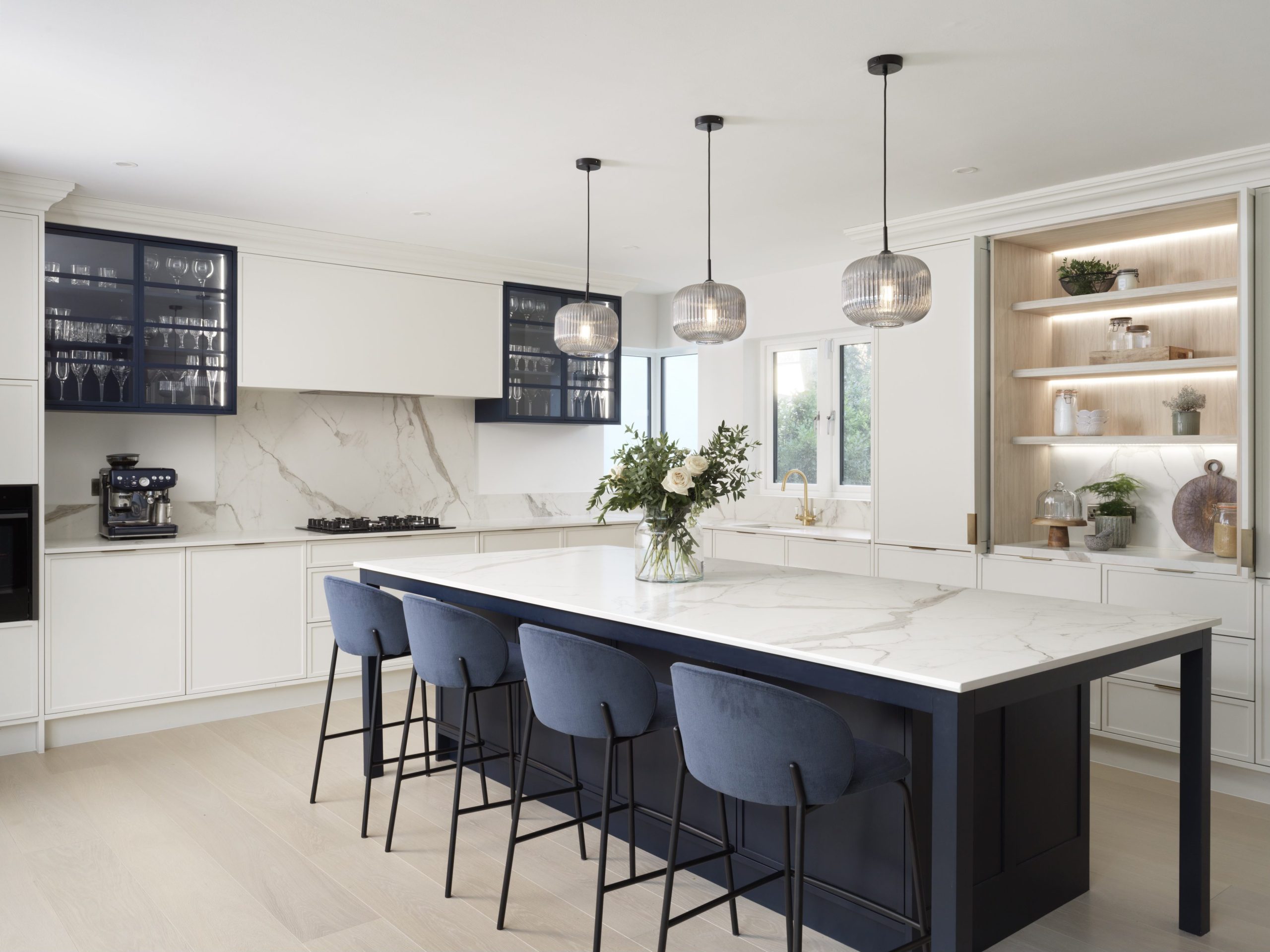 Dundrum Dublin This kitchen blends traditional craftsmanship with modern functionality. Bespoke cabinetry and waterfall countertops on the island create a clean, contemporary aesthetic, while polished stone surfaces and integrated graphite…